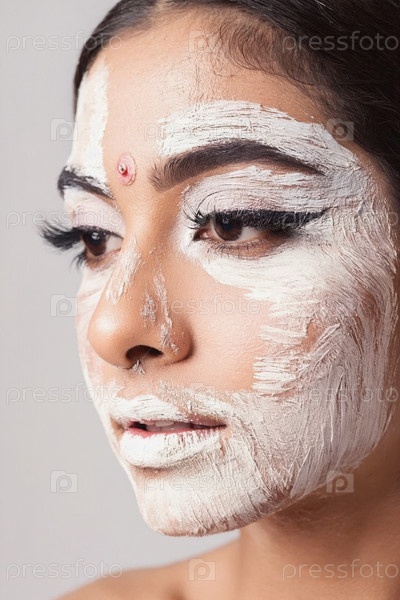 Генеративное женское лицо, покрытое белой глянцевой краской, крупный план женской рекламы красоты
