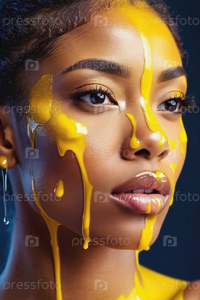 Генеративное женское лицо, покрытое желтой глянцевой краской, крупный план женской рекламы красоты