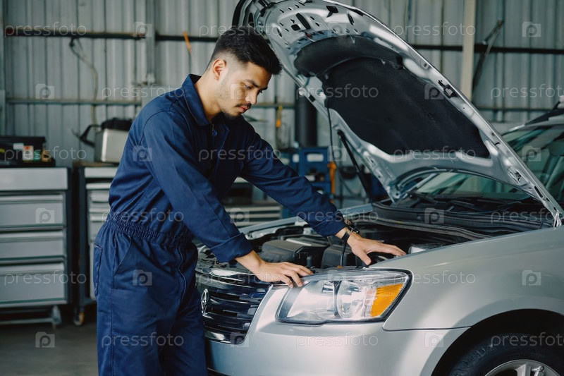 Мужчина автомеханик ремонтирует поломки транспортного автомобиля в обслуживании. ИИ генеративный