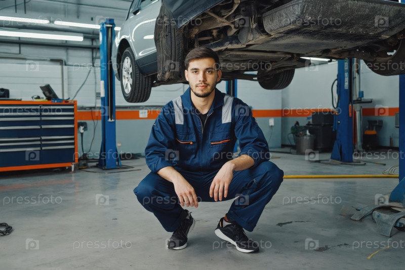 Мужчина автомеханик ремонтирует поломки транспортного автомобиля в обслуживании. ИИ генеративный