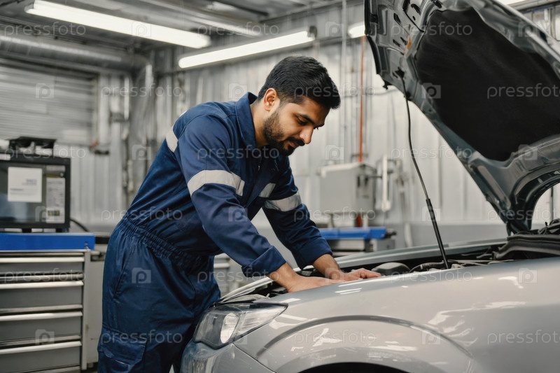 Мужчина автомеханик ремонтирует поломки транспортного автомобиля в обслуживании. ИИ генеративный