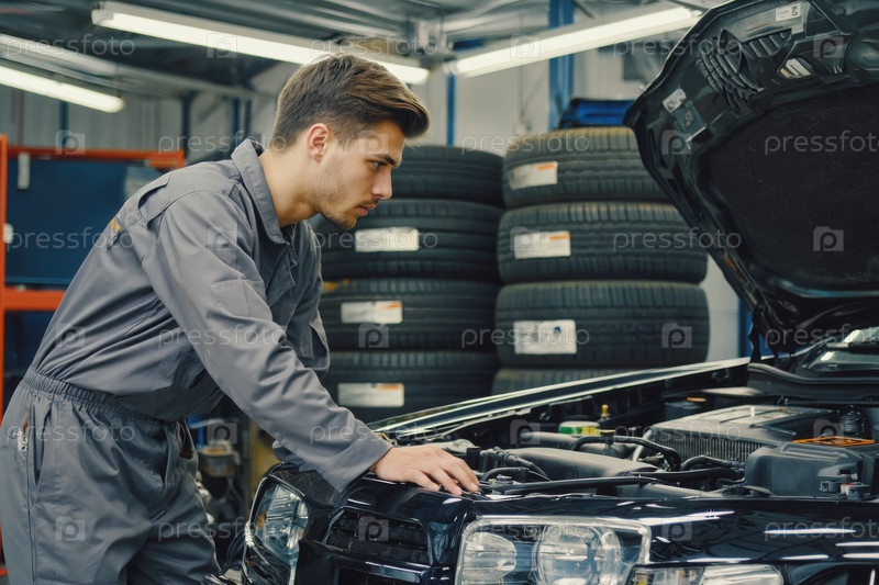 Генеративный человек автомеханик проводит экспертизу поломок и ремонта транспортного средства в автосервисе