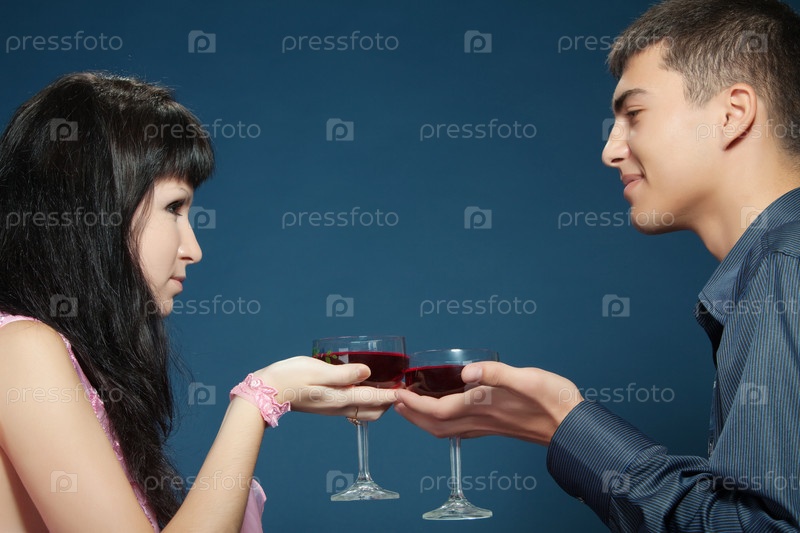 Мужчина и женщина с бокалами красного вина на синем фоне