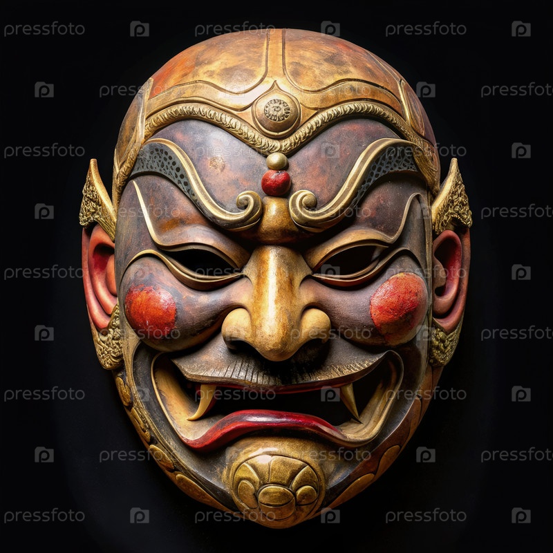 Деревянная маска с красными глазами на черном фоне. Генерирующий ИИ