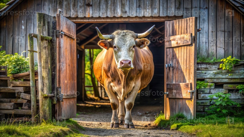 Величественная коричневая корова в передней части сарая. Генерирующий ИИ