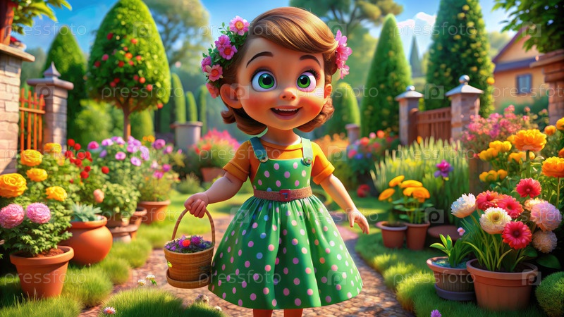 Маленькая девочка в зеленом платье держит корзину цветов Генерирующий ИИ