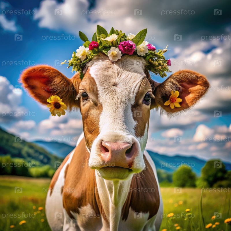 Коричневая и белая корова с цветочной короной. Генерирующий ИИ