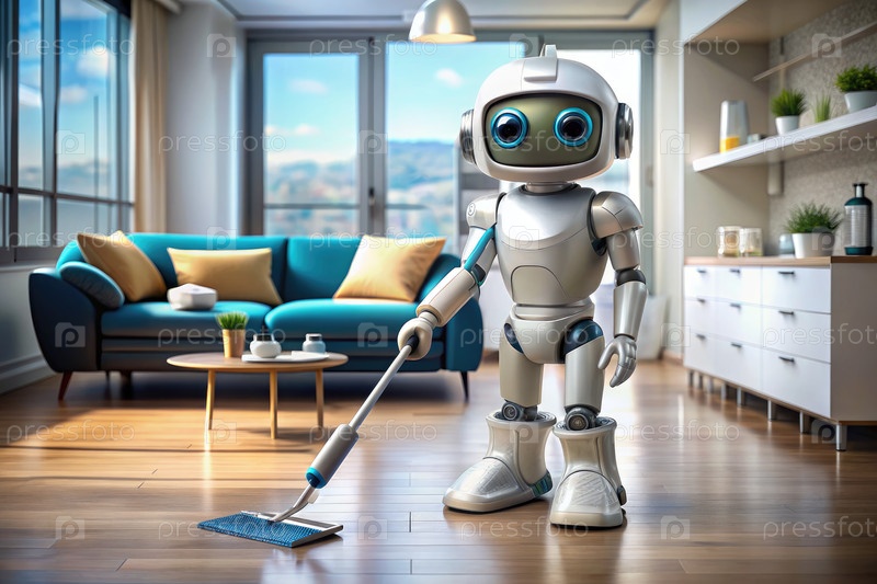 Робот убирает гостиную с помощью Мопа. Generative AI
