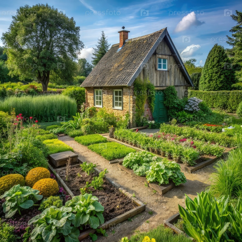 Идиллический сад с маленьким коттеджем на заднем плане. Генерирующий ИИ