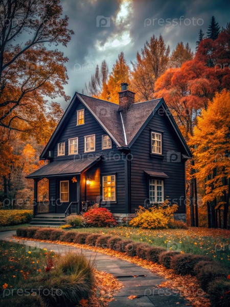 Уютный дом в Fall With Pathway генерирующий ИИ