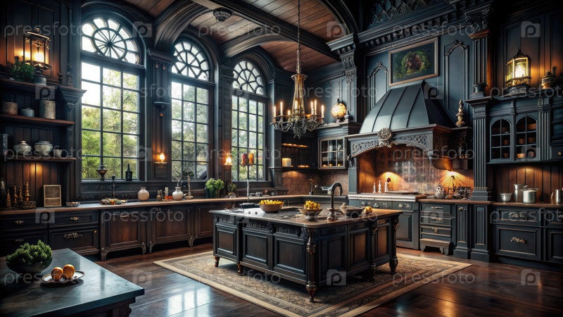 Темная готическая кухня с Центральным островом. Генерирующий ИИ