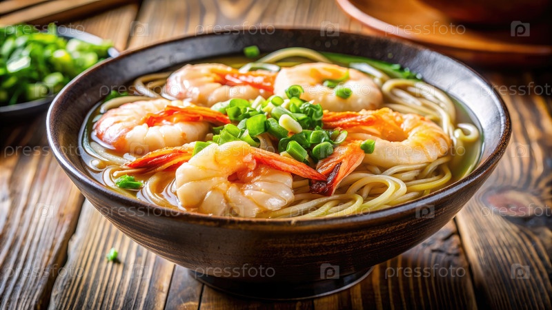 Чаша супа из креветок на деревянном столе. Генерирующий ИИ