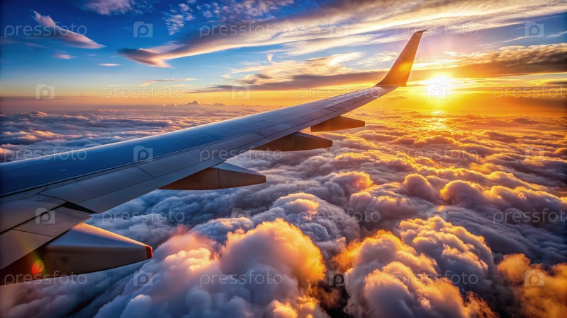 Самолетное крыло против захода солнца. Генеративный ИИ