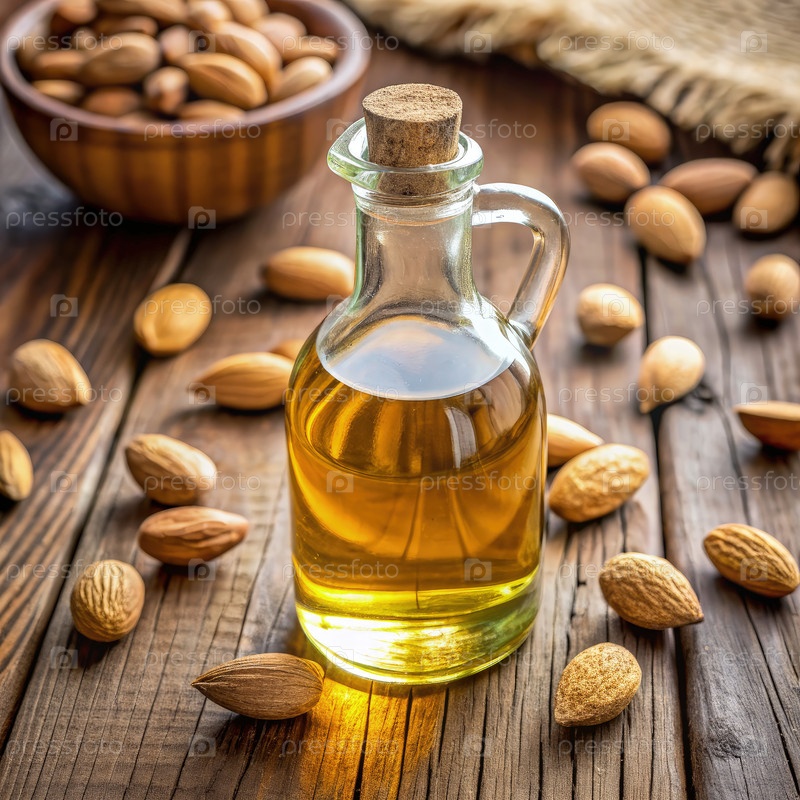 Бутылка миндального масла рядом с миндальной чашей. Генерирующий ИИ