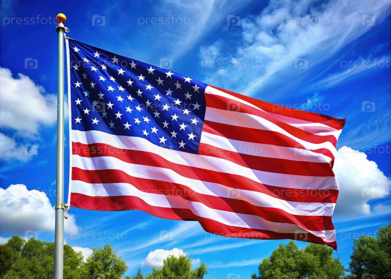 Большой американский флаг, летающий в небе. Генерирующий ИИ