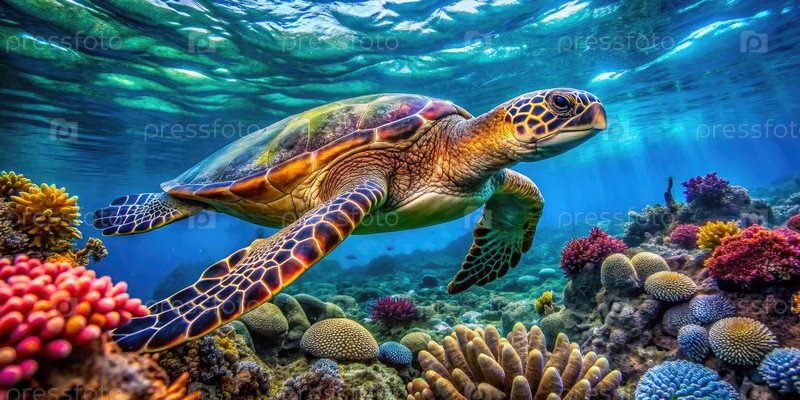Величественная морская черепаха плавает над красочным коралловым рифом. Генерирующий ИИ