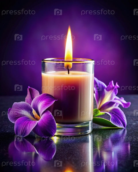 Свеча с фиолетовыми цветами на столе. Генерирующий ИИ