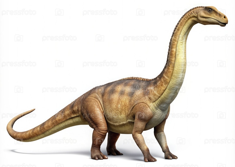 Величественный апатозавр стоит на белой поверхности. Генерирующий ИИ