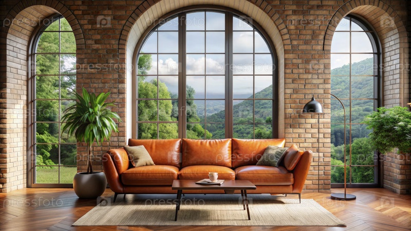 Меблированная гостиная с большими окнами. Генерирующий ИИ