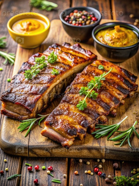 Деревянная режущая доска с ребрами и соусами. Генерирующий ИИ