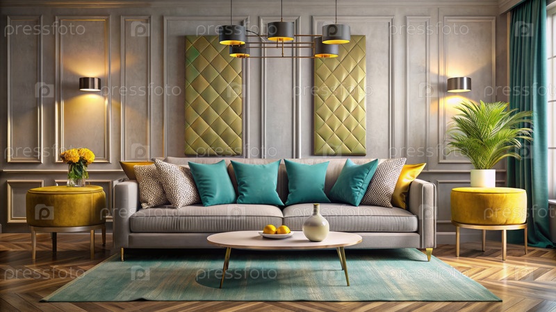 Современная гостиная с мебелью и большим окном. Генерирующий ИИ
