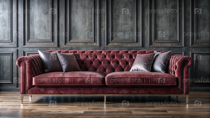 Красный бархатный диван против деревянной стены. Генерирующий ИИ