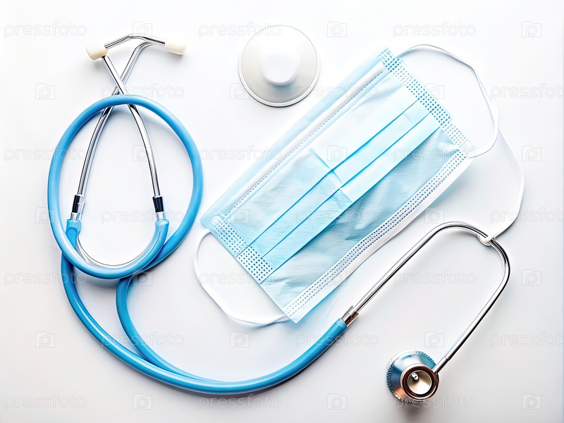 Стетоскоп, медицинская маска и термометр на синем фоне. Генерирующий ИИ