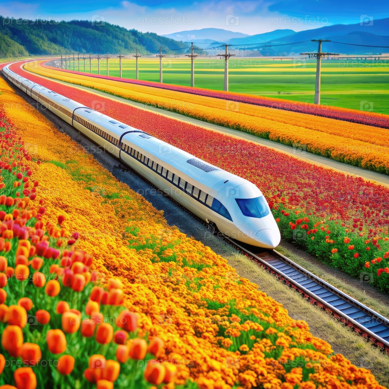 Высокоскоростной пулеметный поезд, путешествующий по полю цветов Генерирующий ИИ