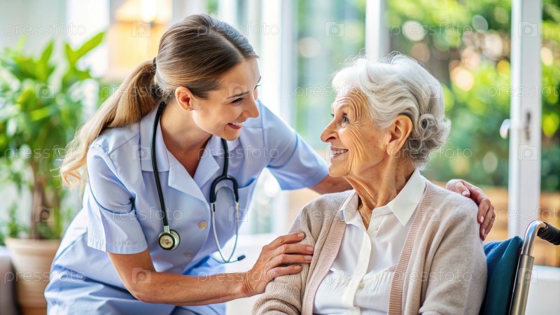 Медсестра помогает пожилой женщине в инвалидном кресле. Генерирующий ИИ