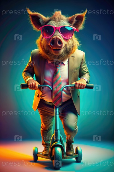 Свинья в костюме и галстук верхом на скутере Генерирующий ИИ