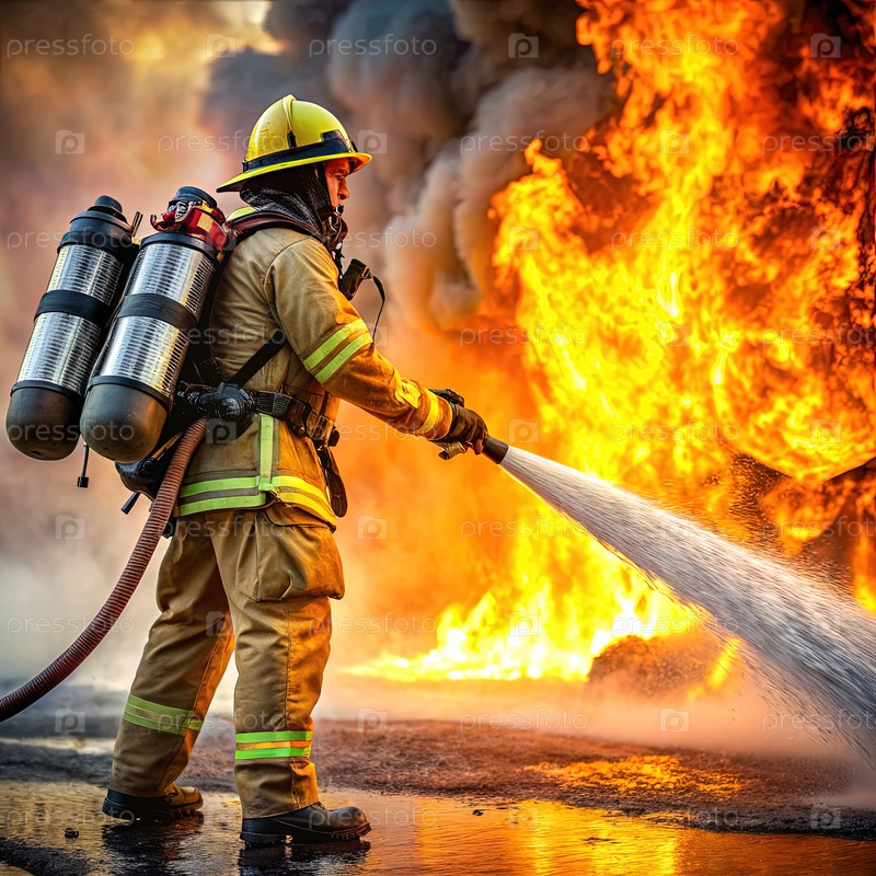 Пожарный тушит огонь с помощью шланга. Генерирующий ИИ