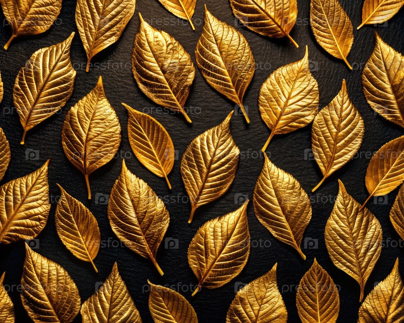 Яркие золотые листья на черной поверхности. Генерирующий ИИ