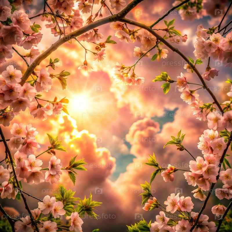 Солнце светит сквозь облака и розовые цветы. Генерирующий ИИ