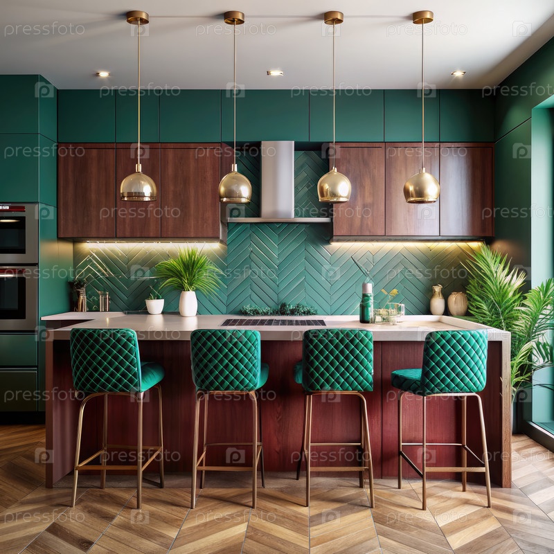 Современная кухня с центральным островом и барными стульями. Генерирующий ИИ