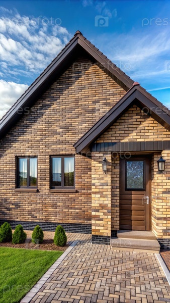 Коричневый кирпичный дом с коричневой входной дверью. Генерирующий ИИ