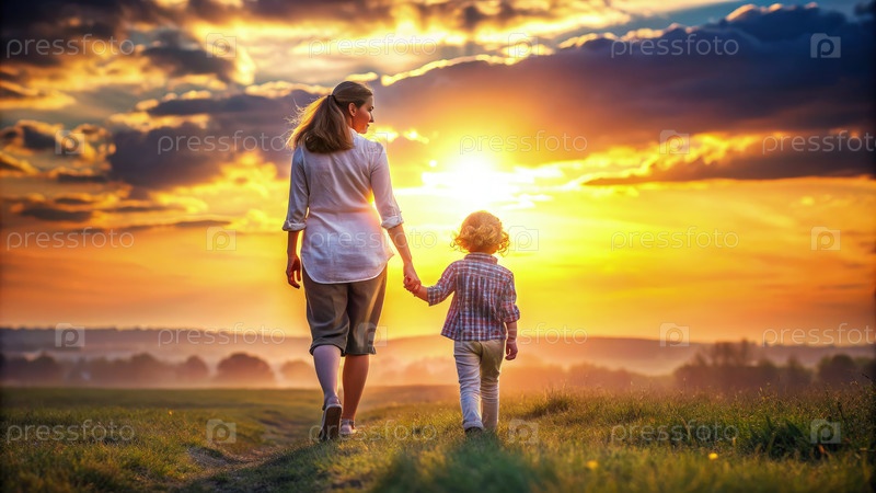 Мать и ребенок гуляют в поле. Генерирующий ИИ