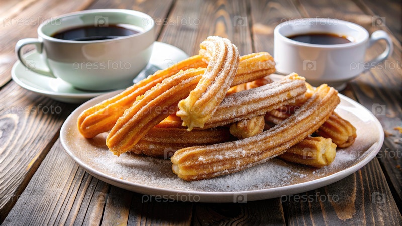 Белая плита Чурроса с чашкой кофе. Генеративный ИИ