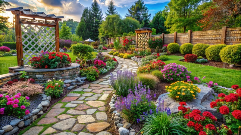 Цветочный сад с каменным путем. Генерирующий ИИ