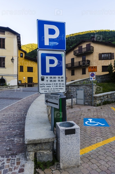 Дорожный знак "Паркинг" на фоне дороге в Европе