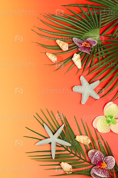 Абстрактный фон с пальмовыми листьями, морскими раковинами, цветами орхидей и звездами. Тропический солнечный красочный баннер. Элегантный красивый подиум и шаблон для вашего творчества, концепция летней вечеринки и стенд для показа продукта