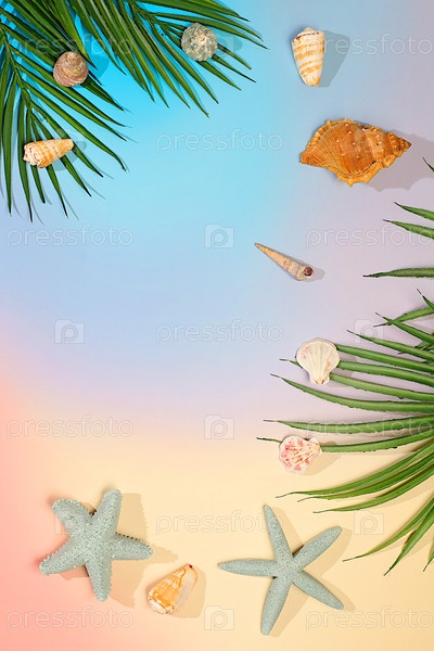 Тропическое солнечное красочное знамя, фон с пальмовыми листьями, ракушками и звездами. Элегантный красивый подиум и шаблон для вашего творчества, концепция летней вечеринки и стенд для показа продукта