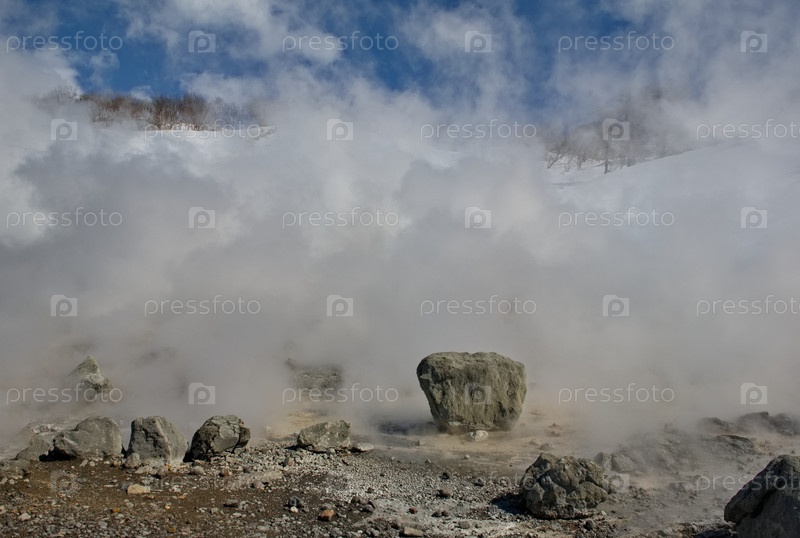 Россия. Курильские острова. Живописный парящий термальный источник (Кипящая река) недалеко от вулкана Барановский на острове Итуруп, температура воды в источнике которого достигает 80 градусов