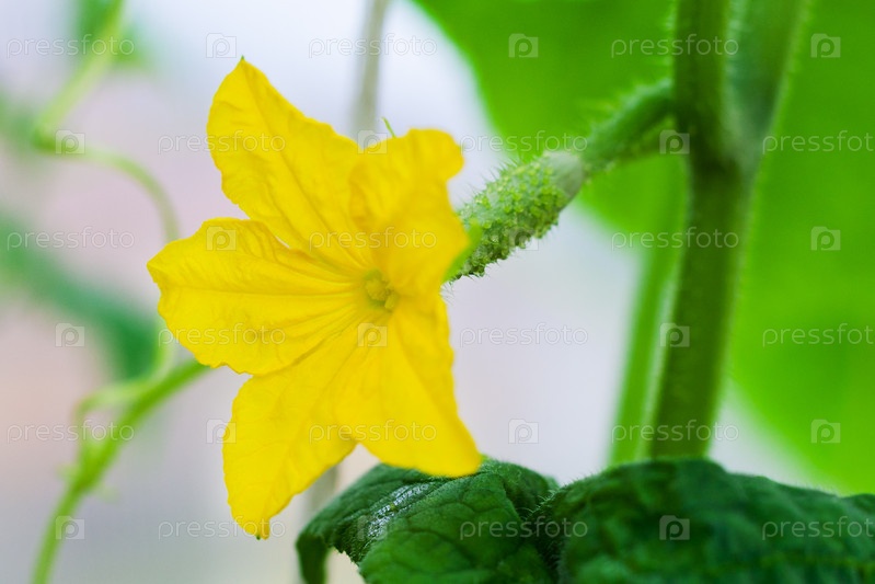 Закрыть вид на молодой растущий огурец с желтым цветком на ветке (небольшая глубина резкости)