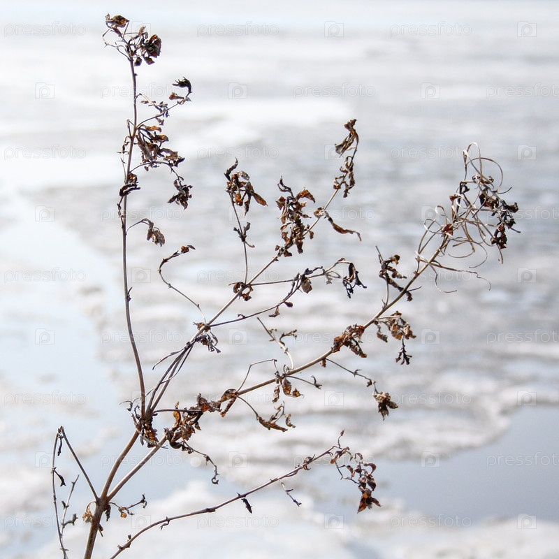 Сухой куст на фоне растрескавшегося льда на воде (малая глубина резкости, квадратное соотношение сторон, концепция)