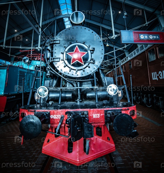 Советский локомотив у платформы крупным планом с поездом под посадку