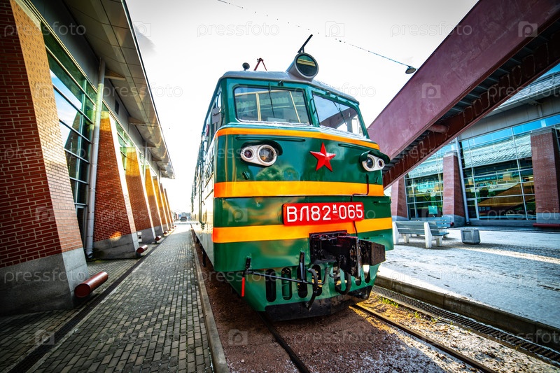 Советский локомотив у платформы крупным планом с поездом под посадку