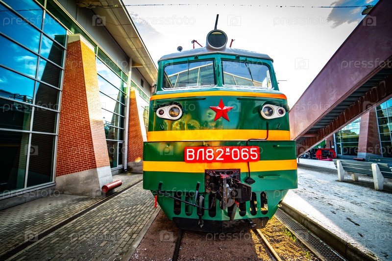 Советский локомотив у платформы крупным планом с поездом под посадку