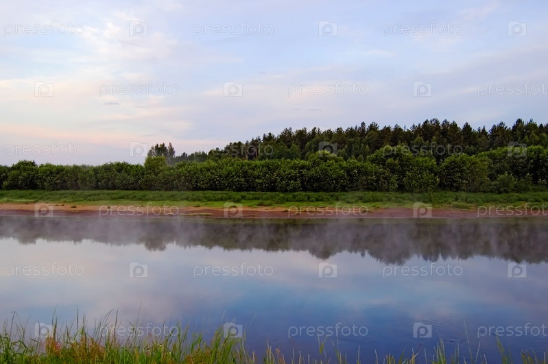 Красивый восход солнца на реке Сосьва на Северном Урале, облака, окрашенные в красные, оранжевые цвета, лес, берег и их отражения в реке