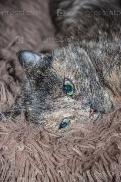Серый котенок крупным планом в лежанке меховой