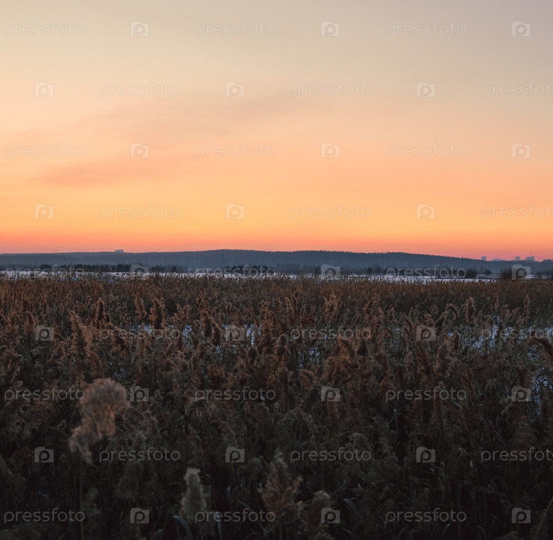 Закат над водно-болотными угодьями создает безмятежный пейзаж с яркими цветами и силуэтами тростника при вечернем свете